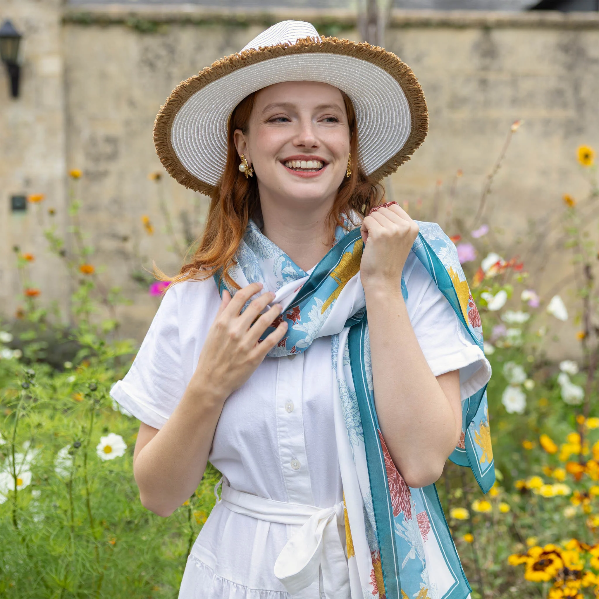 The warmth of sunlit days - captured. Our women’s summer scarf wraps you in a print of delicately sketched chrysanthemums framed by a double border. Bold accents of mustard yellow and rust orange stand out against the calm background of teal and white, creating a relaxing palette reminiscent of beachside holidays and carefree summer moments. The lightweight fabric offers endless styling possibilities - drape around your neck, wrap around your head or tie in your hair. Effortlessly eye-catching, this statement scarf pairs seamlessly with summer dresses or casual denim, a must-have for sunny adventures.