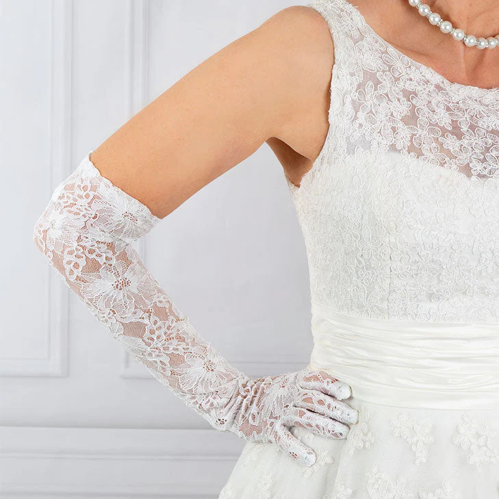 Strike a pose with our pretty long lace gloves. Extending to the upper arms, these opera gloves offer our longest length available providing incredible coverage. Made from a cotton/nylon mix, they boast a gentle stretch that holds the gloves in place while staying comfortable to wear with no horrible sagging or loss of shape. The floral lace pattern adds delicate beauty, perfect for every kind of formal occasion. Whether you wear with your wedding dress on your big day or a gorgeous gown to a ball or black tie event, these full-length gloves are picture perfect.
